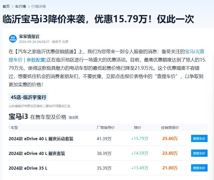 最近,在宣布涨价三个月后又被曝出重回“价格战”的宝马,其电动车终端优惠力度空前,包括iX1、i3、iX3、i7等,降幅在10万元至30万元不等。以宝马i3为例,其终端优惠幅度已经超过了15万元,这意味着它在部分市场的实际裸车价已经来到了真正的20万级,放在国内自主纯电动车市场,相当于一台吉利生产的极氪007。