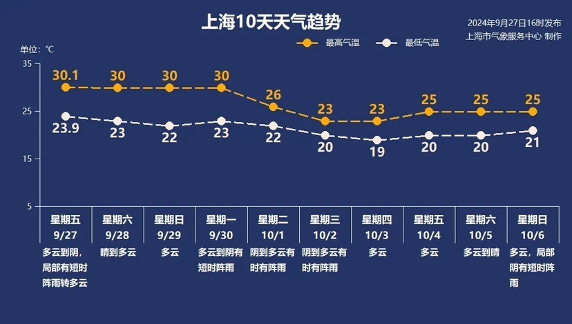 节前,上海以晴或多云为主,下周一有短时阵雨,气温在22℃-30℃之间,天气晴朗但白天也会稍许有些热。