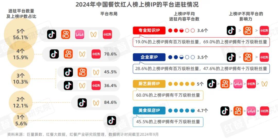 56.1%的上榜IP进驻了5个内容平台。而进驻4个平台的上榜IP占15.9%,其中大多数IP以抖音、快手、视频号和小红书为主要阵地,值得注意的是,无论上榜IP选择入驻多少个平台,抖音都成为了它们不可或缺的标配,体现了抖音在餐饮IP内容传播中的核心地位。