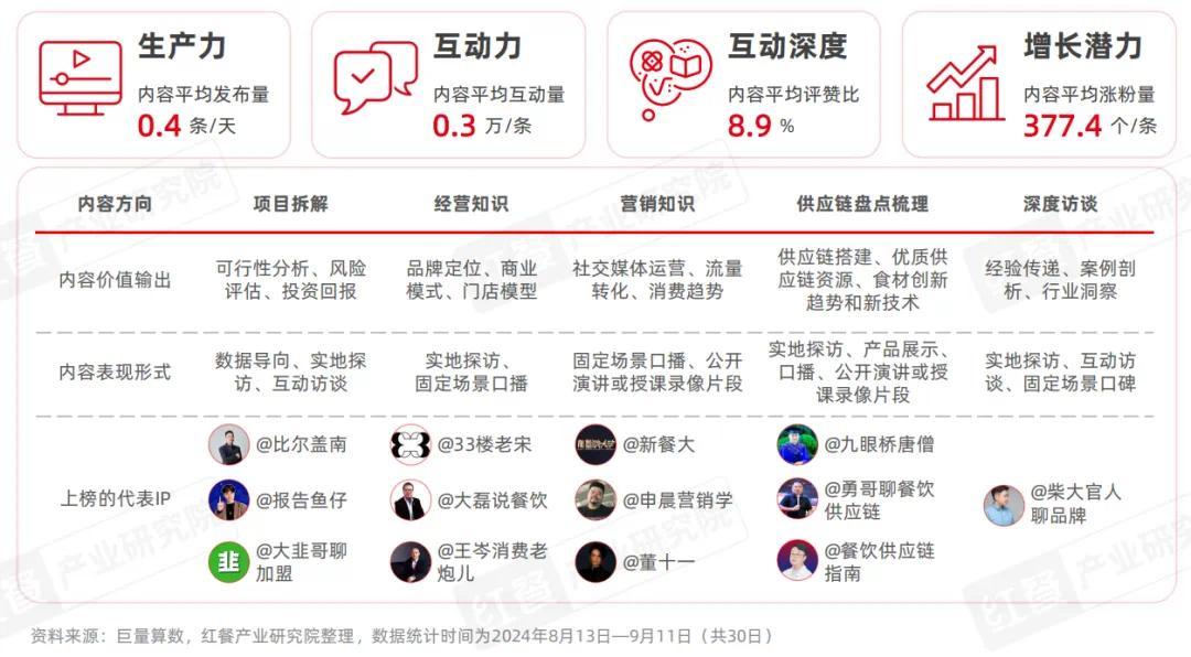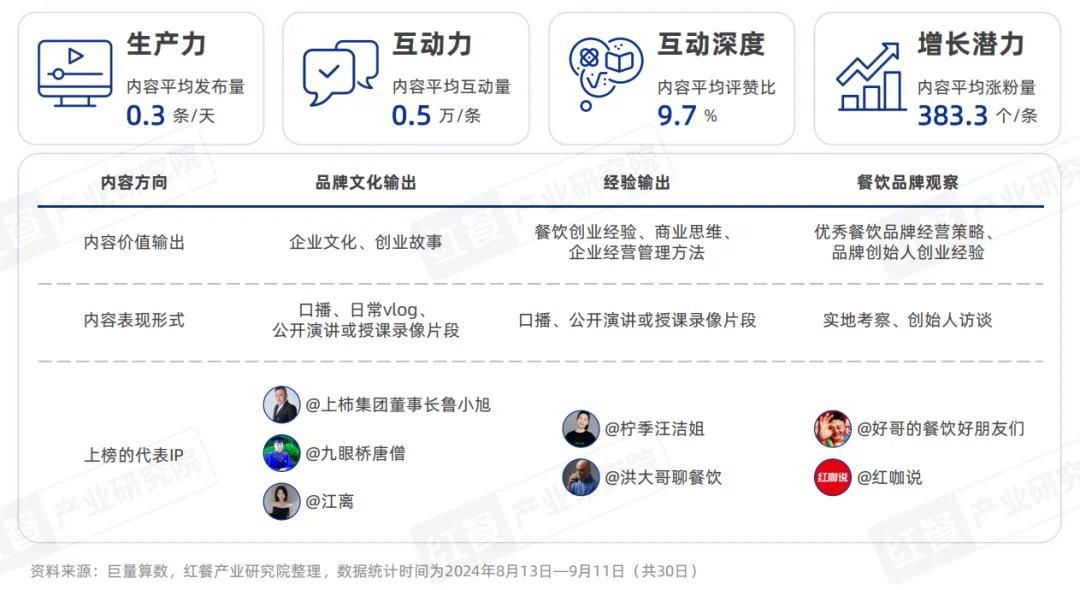 整体上看,企业家IP在餐饮行业中具备较强的影响力,其持续的内容输出不仅传播了品牌价值,增强了消费者对品牌的情感连接,还不间断地为行业积极发声,推动餐饮行业的发展和壮大。
