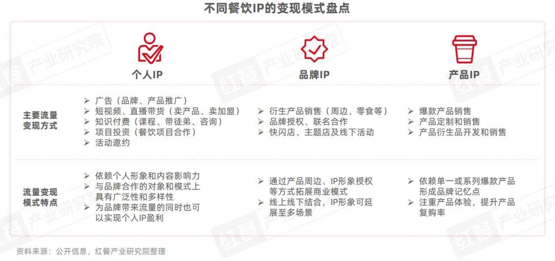 流量变现方面,不同类型的餐饮IP在商业化路径上有明显的差异。