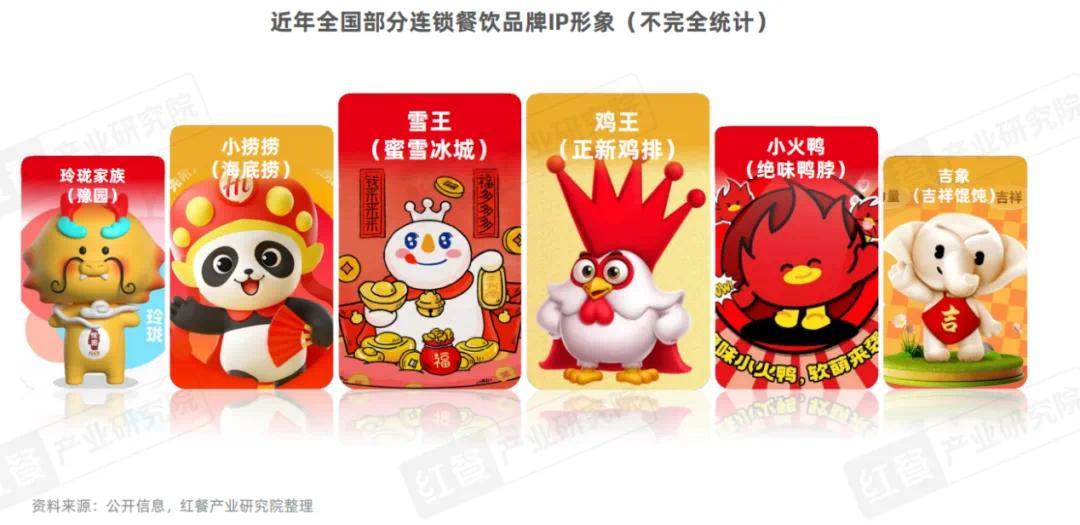 而品牌IP方面主要以契合品牌文化的卡通形象为主。近年来餐饮品牌越来越注重IP形象的开发和运营,据红餐产业研究院不完全统计,2024年海底捞、绝味鸭脖、豫园、吉祥馄饨等品牌均推出新的IP形象。