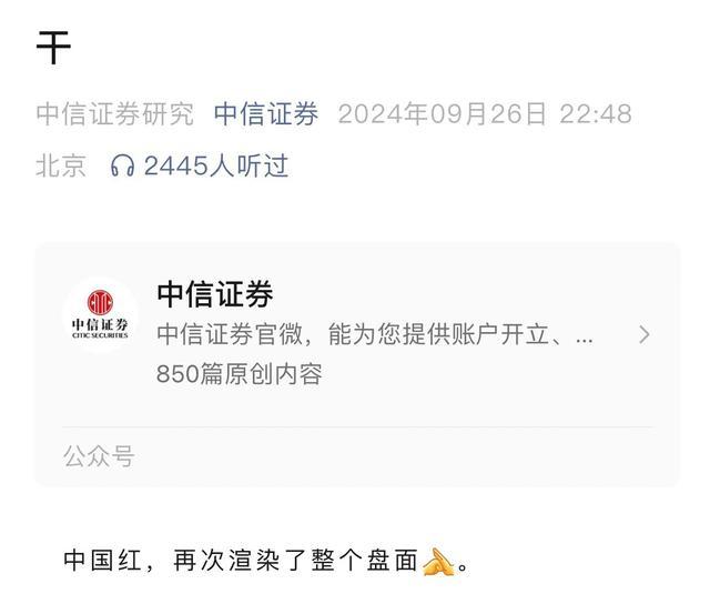 9月26日晚间,中信证券研究部在公司官微发布文章刷屏,标题仅一个字:“干”,还在报告中表示:“中国红,再次渲染了整个盘面。”