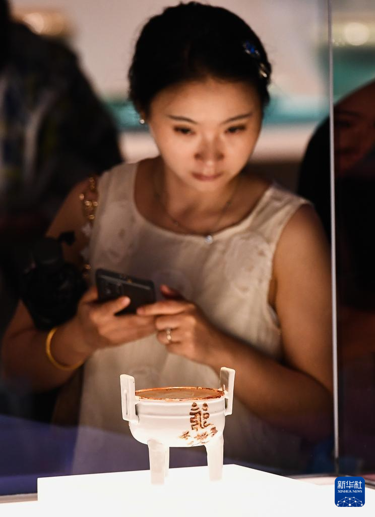 9月27日,观众在参观特展中的展品——白釉双耳描金麒麟纹鼎式三足炉。 新华社记者 杨冠宇 摄