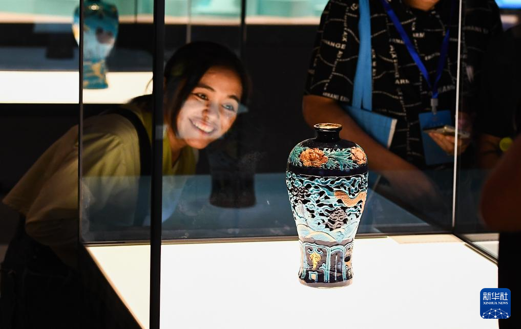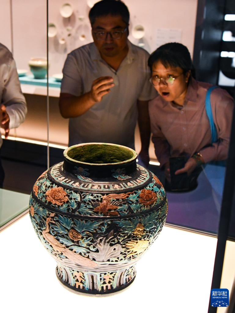 9月27日,观众参观特展展品——珐华贴金镂空孔雀牡丹纹大罐。 新华社记者 杨冠宇 摄
