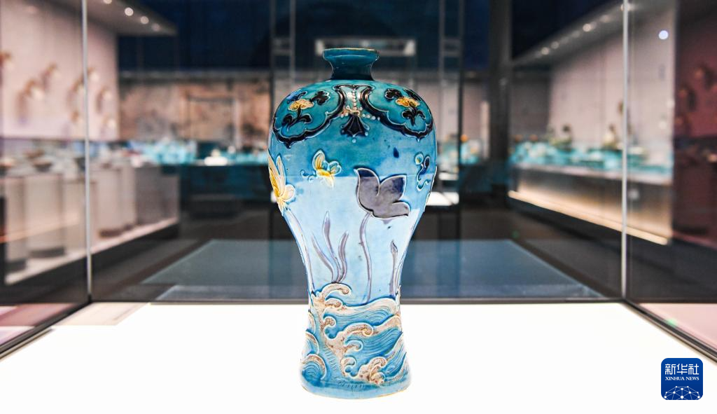这是9月27日在特展上拍摄的展品——珐华孔雀绿釉莲池纹瓶梅。 新华社记者 杨冠宇 摄