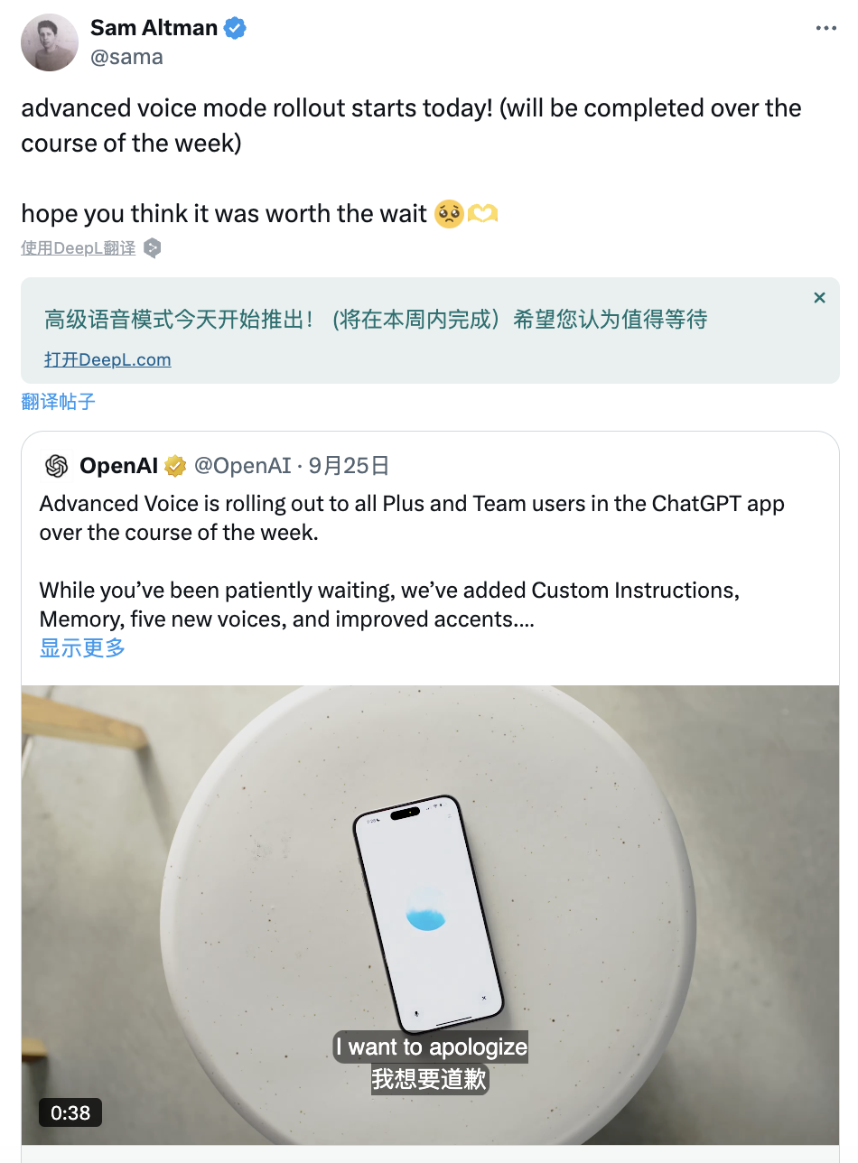 在GPT-4o的发布会上,最令人震惊的就是它的语音交互能力,像人一样对话的节奏感、超逼真的语气,在期货了4个月之后终于来了。这项功能会在一周内全量推出,多亏社群里近日点科技的阿茶老师提供账号,让我们能第一时间上手玩到。