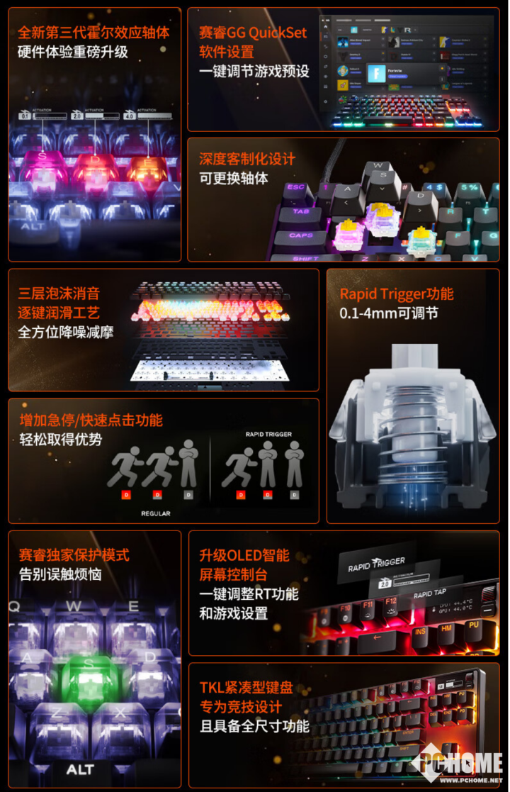 赛睿还进行了深度客制化设计,支持更换轴体和动态单键RGB灯光,升级双色PBT键帽,三层消音泡沫及逐键润滑工艺,全方位降噪并减少摩擦,进一步提升打字触感。新产品支持“赛睿保护模式”,1mm以下低驱动水平自动触发,智能降低周围按键灵敏度。同时还升级了OLED屏幕控制台,支持一键调整RT功能和游戏设置。另外还支持双动作按键,用户仅用一个按键就能完成两个动作。