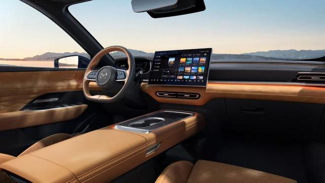 在体现EV车型未来感的同时,马自达致力于营造专注驾驶的“人马一体”座舱,EZ-6的仪表板整体采用悬浮式造型,简洁的中央扶手提供适度的包裹感,可以让驾驶者放松身心的同时集中精力驾驶。内饰选材考究,搭配精致的哑光镀铬装饰件等,做工精良。