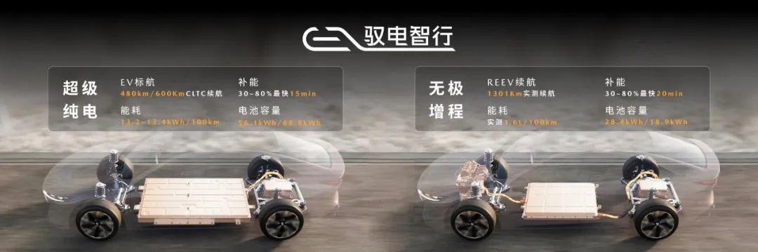 而REEV增程车型则提供28.4KWh和18.9KWh两种电池包,纯电续航里程分别为200KM和130KM,油箱容量为45L,百公里能耗低至3.6L,实测续航1301公里,30%~80%充电最快20分钟。