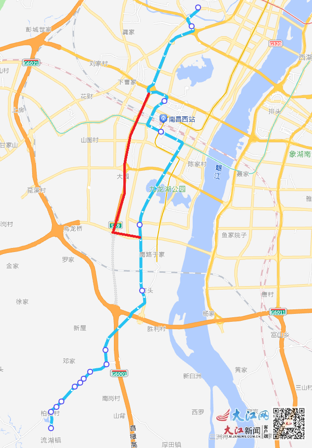 调整后线路走向:开关厂停车场—兴国路—长征西路—长堎大道—西一环路—洪州大道西—九龙大道—璜北段—黄流段—流湖(往返,全程59公里);