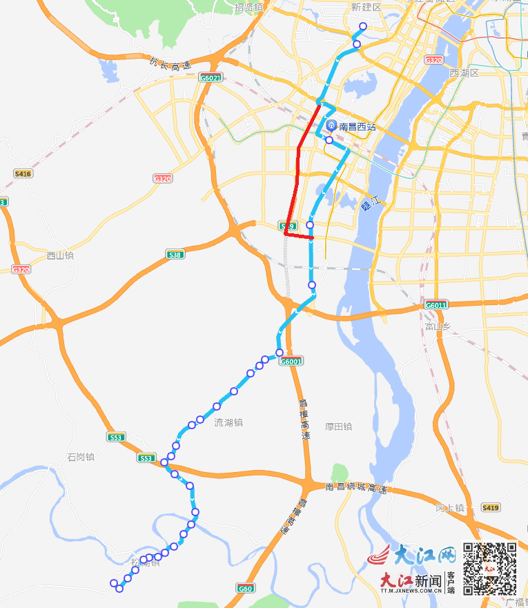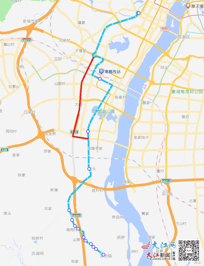 停靠站点:开关厂停车场、红谷新城、九龙大道南、金燕温泉大道北、东岗桥、北头村、车塘村、前坊村、柏树村、莲塘村、岗口二桥、曹山村、流湖横岗村北、流湖横岗村、北城村、红岗村、锡岗村、义渡、义渡桥头、钱洲小学、钱洲村、潢坊村、松湖新街口、松湖新街、南湾村、龙潭汪家、兰溪村路口、松湖老街;