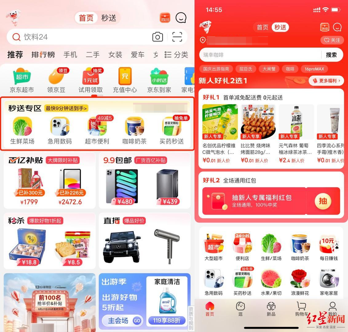 左:京东APP首页“秒送”入口 右:京东APP“秒送”页面 图源:京东APP