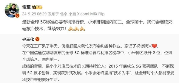 雷军:小米5G标准必要专利国内前三 继续死磕核心技术