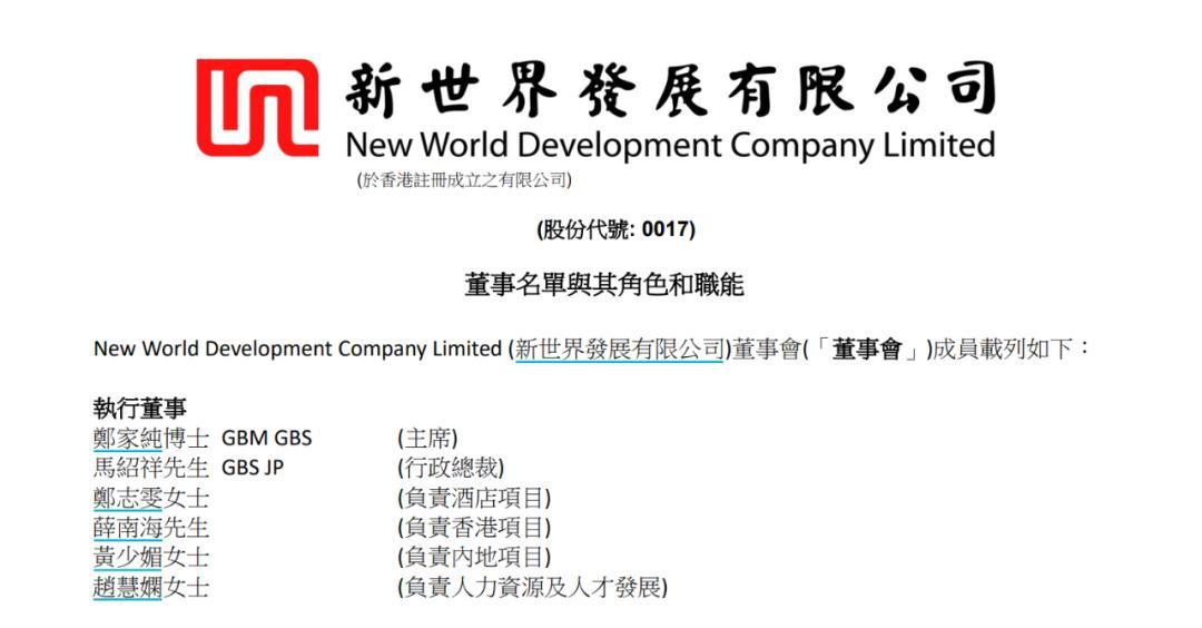 9月26日,新世界发展发布董事会成员变更公告,郑志刚辞任行政总裁,调任为非执行副主席及非执行董事。公司首席营运总监马绍祥将接替郑志刚,成为新世界发展行政总裁。