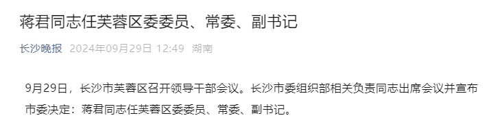 9月29日,长沙市芙蓉区召开领导干部会议。长沙市委组织部相关负责同志出席会议并宣布市委决定:蒋君同志任芙蓉区委委员、常委、副书记。