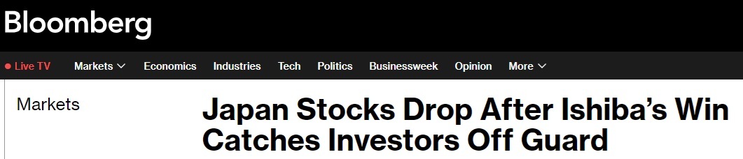 日本股市暴跌反映投资者对石破茂政策方向的不确定性,彭博社称,这迫使投资者削减此前基于高市早苗(Sanae Takaichi)将成为日本新首相并鼓励日本央行保持低利率的猜测而建立的头寸。