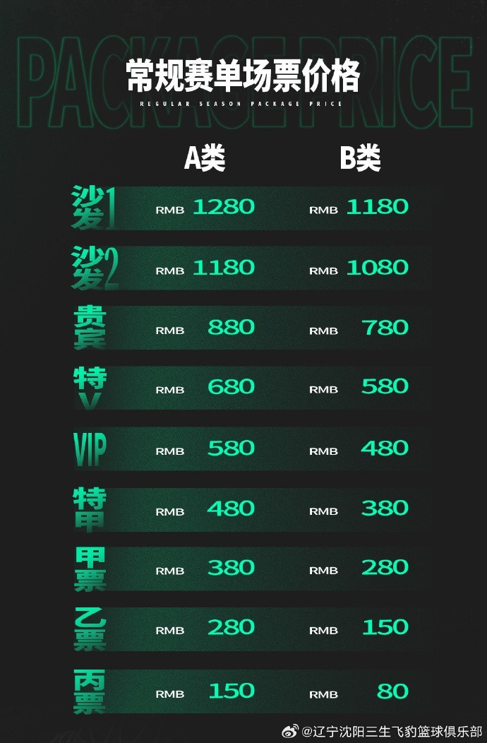辽宁男篮新赛季单场门票,最便宜的为B类场次丙票,80元;最贵的为A类场次沙发票1,1280元。票价类别分别分为沙发1、沙发2、贵宾、特V、VIP、特甲、甲票、乙票、丙票。