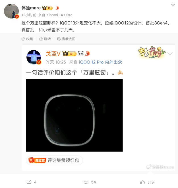 值得注意的是,2024年10月,搭载骁龙8 Gen4的手机,除了小米15、荣耀Magic7、一加13,还会有iQOO 13。数码博主“体验more”爆料称,iQOO 13延续iQOO 12的设计语言,外观变化不大,发布时间和小米差不了几天。