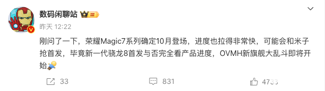尽管目前大部分消息都显示,小米15系列将首发骁龙8 Gen4,但也有博主爆料称,荣耀Magic7有可能“截胡”小米。2024年9月26日,知名数码博主“数码闲聊站”爆料称,“荣耀Magic7系列确定10月登场,进度也拉得非常快,可能会和米子抢首发”。与小米15系列手机主打强悍的性能不同,荣耀Magic7内部代号为“钢铁侠”,主打类似贾维斯的全能AI体验。
