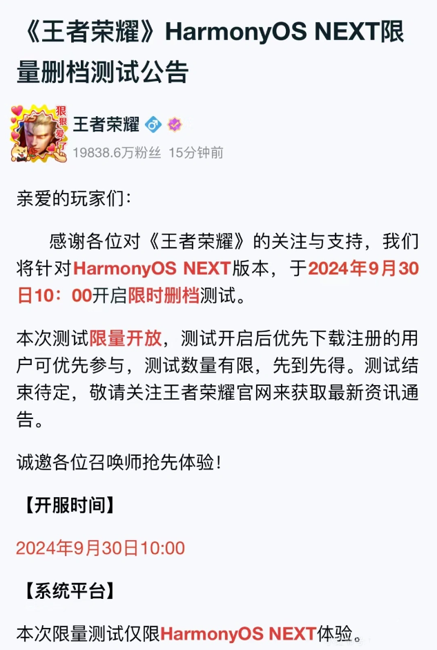 其中《王者荣耀》官方宣布,针对HarmonyOS NEXT版本推出《王者荣耀前瞻版》,将于9月30日10:00开启限时删档测试,测试限量开放。需要注意的是,玩家只可以使用QQ扫码或者QQ密码登录游戏,微信账号暂时无法登录。