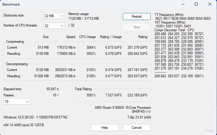 至于处理器的运算能力,这里也进行了测试。R9-9950X的表现还是非常不错的,特别是在AES-256或SHA-1 Hash项目里。并且这颗处理器还有2CU的核显加持,也能够提供一定的运算能力。