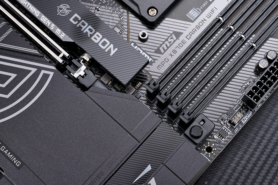 M.2接口就更丰富了,微星MSI MPG X870E CARBON WIFI暗黑主板一共提供了4个M.2接口,其中M.2_1与M.2_2均是由CPU提供的Gen5×4 128Gbps 插槽,而M.2_3与M.2_4则是由PCH提供的 Gen4×4 64Gbps 插槽。