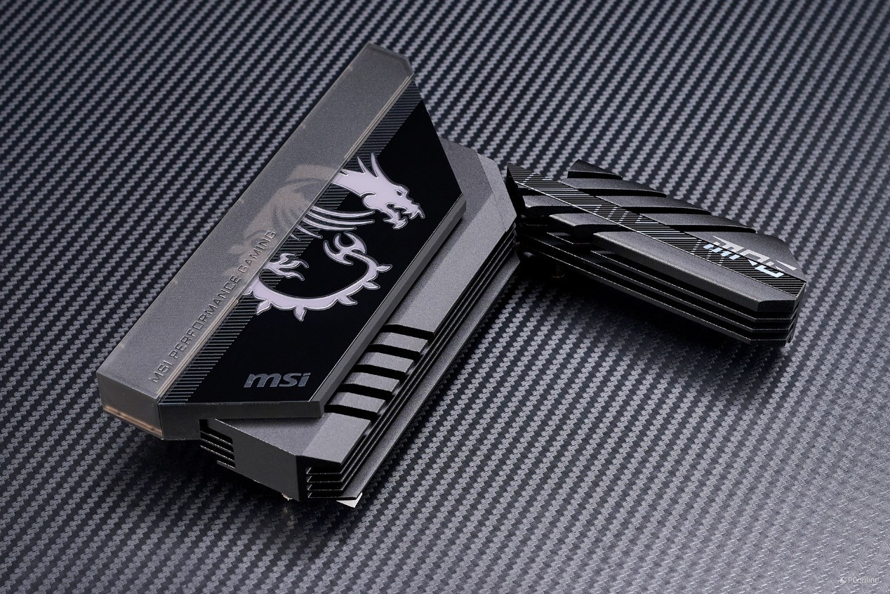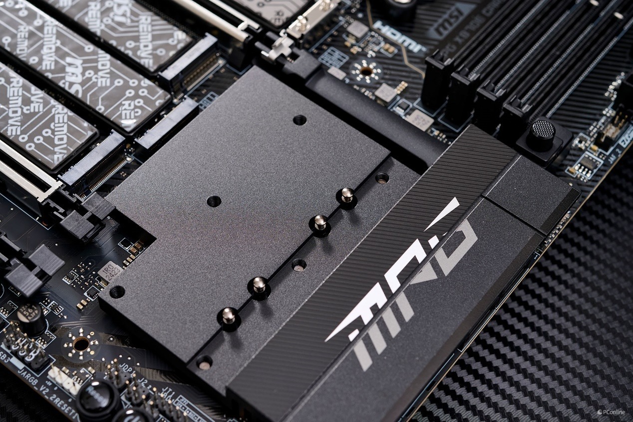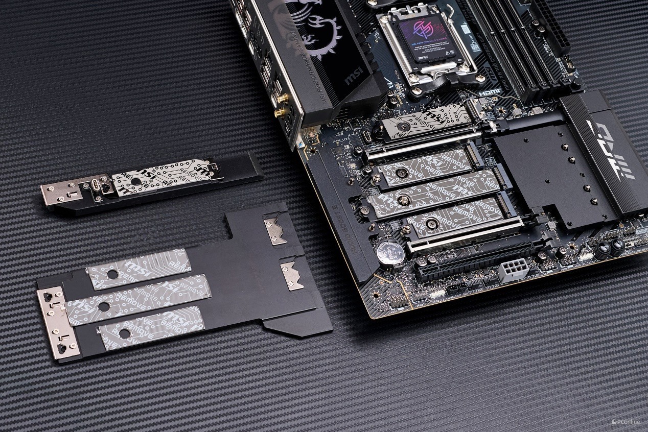 当然,高速率的存储速度也带来了更高的热量,因此微星也给这款主板安排了厚实的冰霜铠甲,并且这个装甲也改为免螺丝设计,并且不像上一代主板只有顶部一个插槽有,这次是全覆盖!