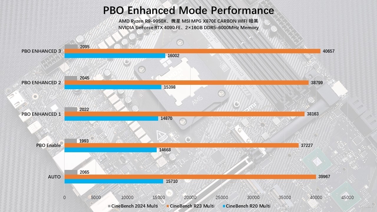 实测开启PBO增强模式后的R9-9950X又有了不小的性能增益,特别是PBO ENHANCE 3档位,性能增长是肉眼可见的,CineBench 2023的多核测试,R9-9950X直接冲上4w分大关。相比AMD原生的PBO模式,性能强了约8%左右,强烈建议锐龙9000系处理器的玩家搭配微星MSI MPG X870E CARBON WIFI暗黑主板,并开启这个功能!