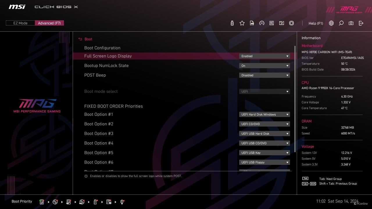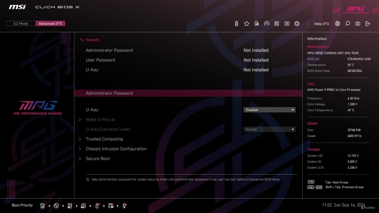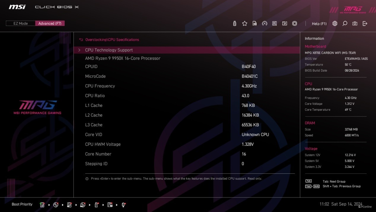 除了外部硬件升级,微星也给AMD 800系主板的BIOS来了一次大更新!全新的BIOS界面用上了更新潮的UI界面,并且据微星的说法,不同系列会有专属的BIOS设计,例如我们手上的微星MSI MPG X870E CARBON WIFI暗黑主板的BIOS界面里就有独属“MPG”的Logo。