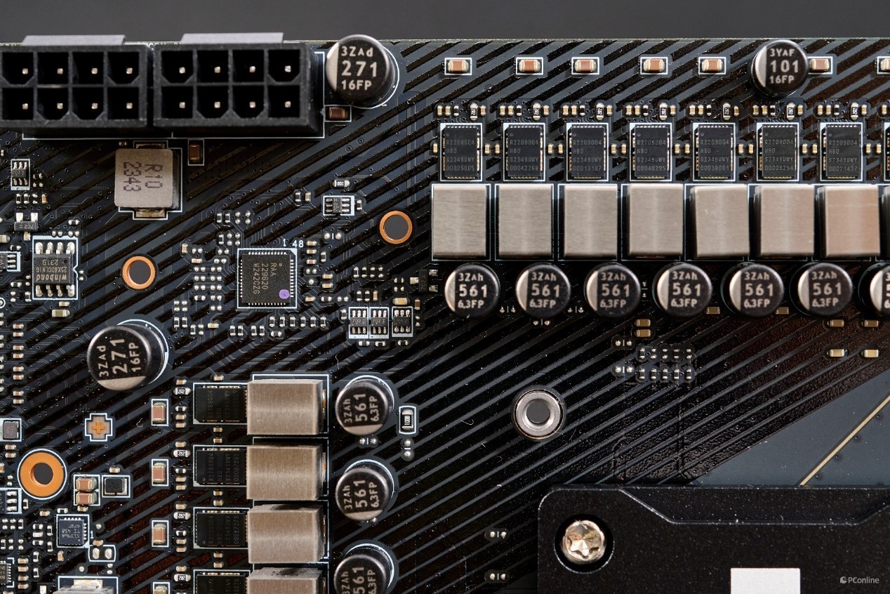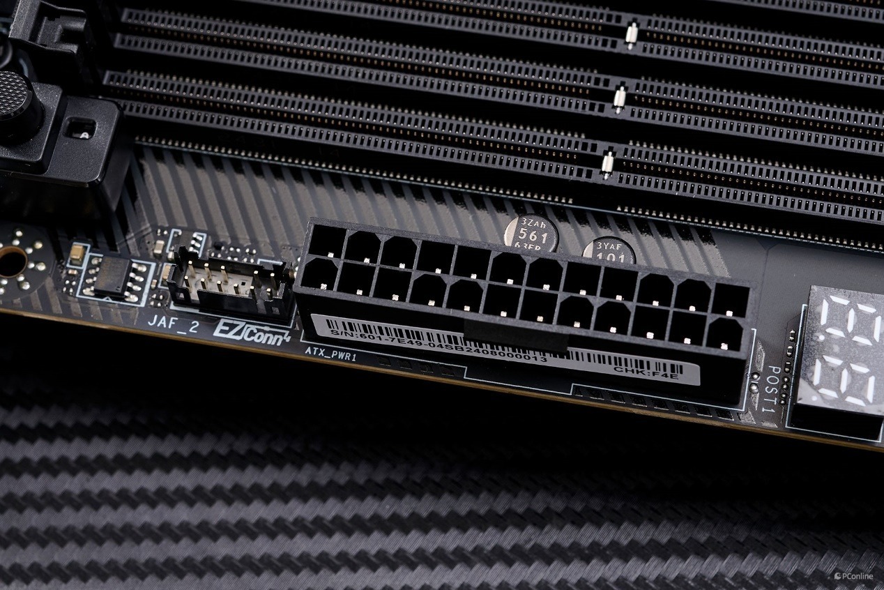 主板供电部分,CPU的供电接口为双Pin,主板的右侧依旧是24Pin供电接口,是硬件能够稳定运转的重要保障之一。