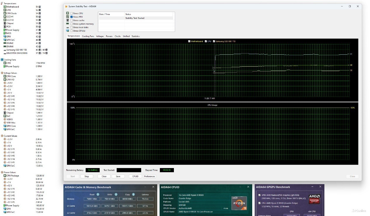 理论测试部分,首先上场的是大家熟悉的CPU-Z,这里不仅可以看到所有硬件信息,还能对处理器进行一定的性能测试。从下图可知,R9-9950X支持DDR5内存,此次测试内存运行在6000MHz Gear2模式下。除此之外,显卡则是普普通通的RTX 4090,想必没有人会怀疑这套平台的性能表现。最重要的CPU基准测试我们也进行了,实测R9-9950X跑出了单核873,多核16764.7的成绩,你可能对这个成绩没有概念,它再单核性能上能够比14900KS强10%左右!