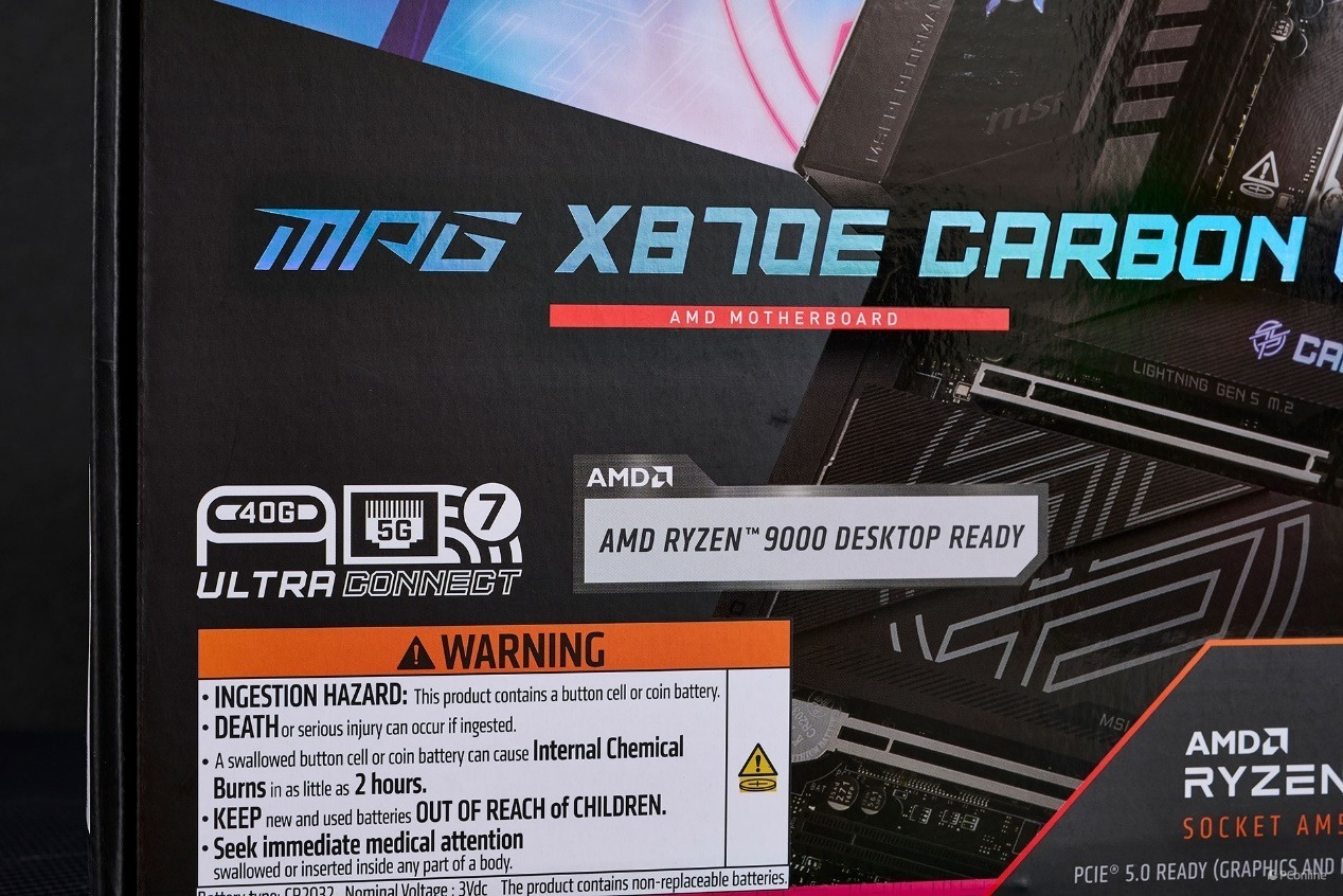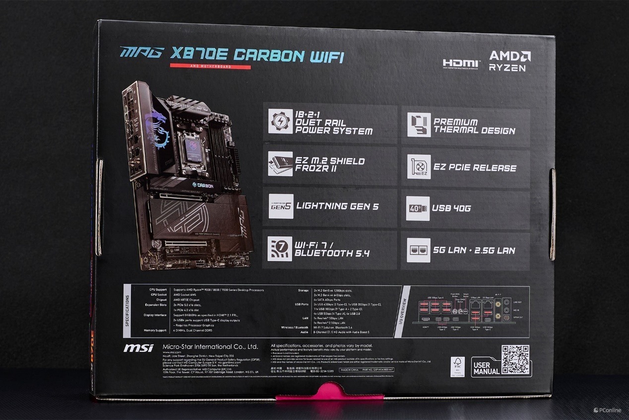 该来看看主板了,首先微星AMD 800系主板在外包装设计上就与上代迥然不同。微星MSI MPG X870E CARBON WIFI暗黑主板外包装换上了最新的MPG系列产品设计语言,比之前的产品更具有风格化,高饱和度、高明亮度的色彩,搭配简洁的排版能够让你一眼就关注到它。