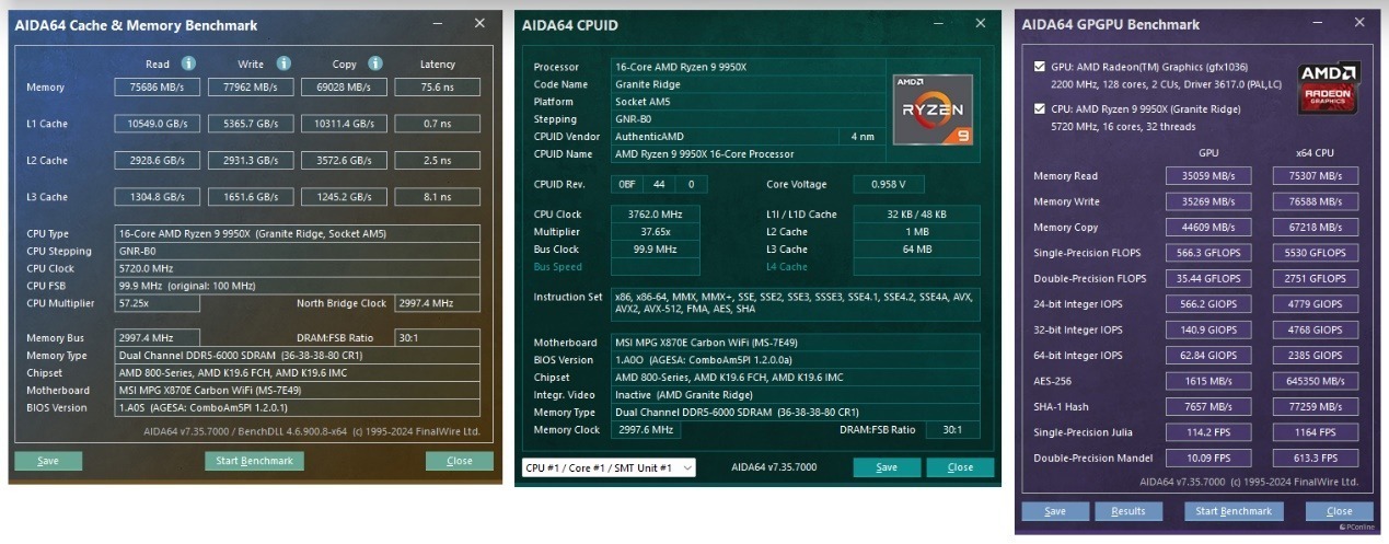 因为锐龙7000或锐龙9000处理器的内存甜点频率在6000MHz左右,因此这里我们也是开启了EXPO设定,将内存超频至DDR5-6000MHz C36。此时读取75686 MB/s,写入77962 MB/s、复制69028 MB/s,甚至延迟也不错,仅75.6ns。