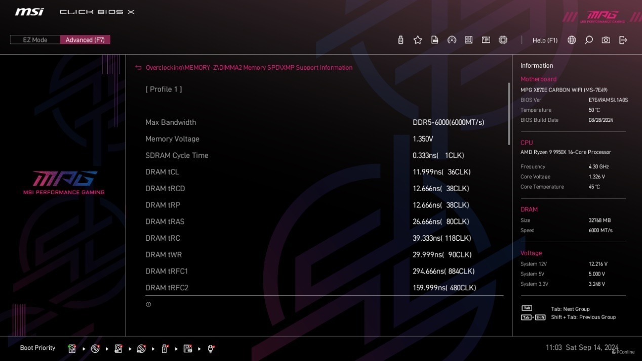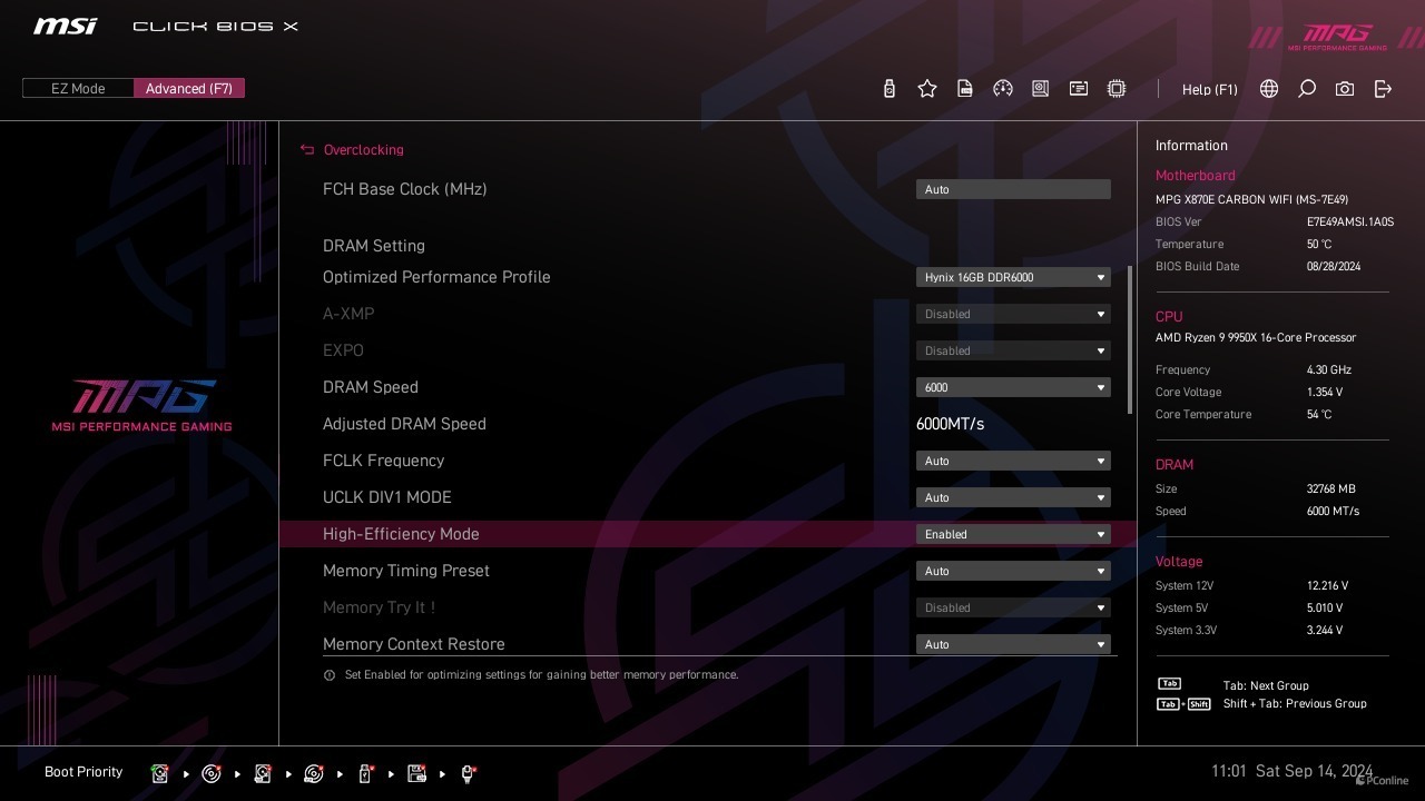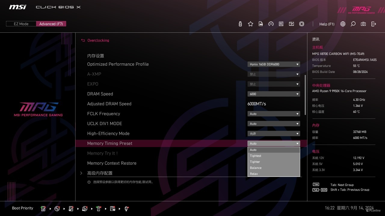 除了AMD OPP功能外,微星MPG X870E CARBON WIFI暗黑主板还引入了内存高性能模式High Efficiency mode,说是对SK海力士A-die颗粒的专属优化,实际上就是对内存小参动手了,通过优化这些小参让内存达到更高的传输速度以及更低的延迟。High Efficiency mode模式提供四档选择,从高到低分别是Tightest, Tighter, Balance和Relax。