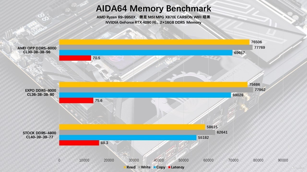 BIOS更新也聊完了,照例介绍一下本次的测试平台,为了发挥微星MSI MPG X870E CARBON WIFI暗黑主板的最佳效能,我们用的是目前AMD最旗舰的R9-9950X处理器,BIOS中的PBO全设置为PBO AUTO,而内存则是选择了带有EXPO设定的DDR5-6000 C36两根16GB组成32GB双通道。