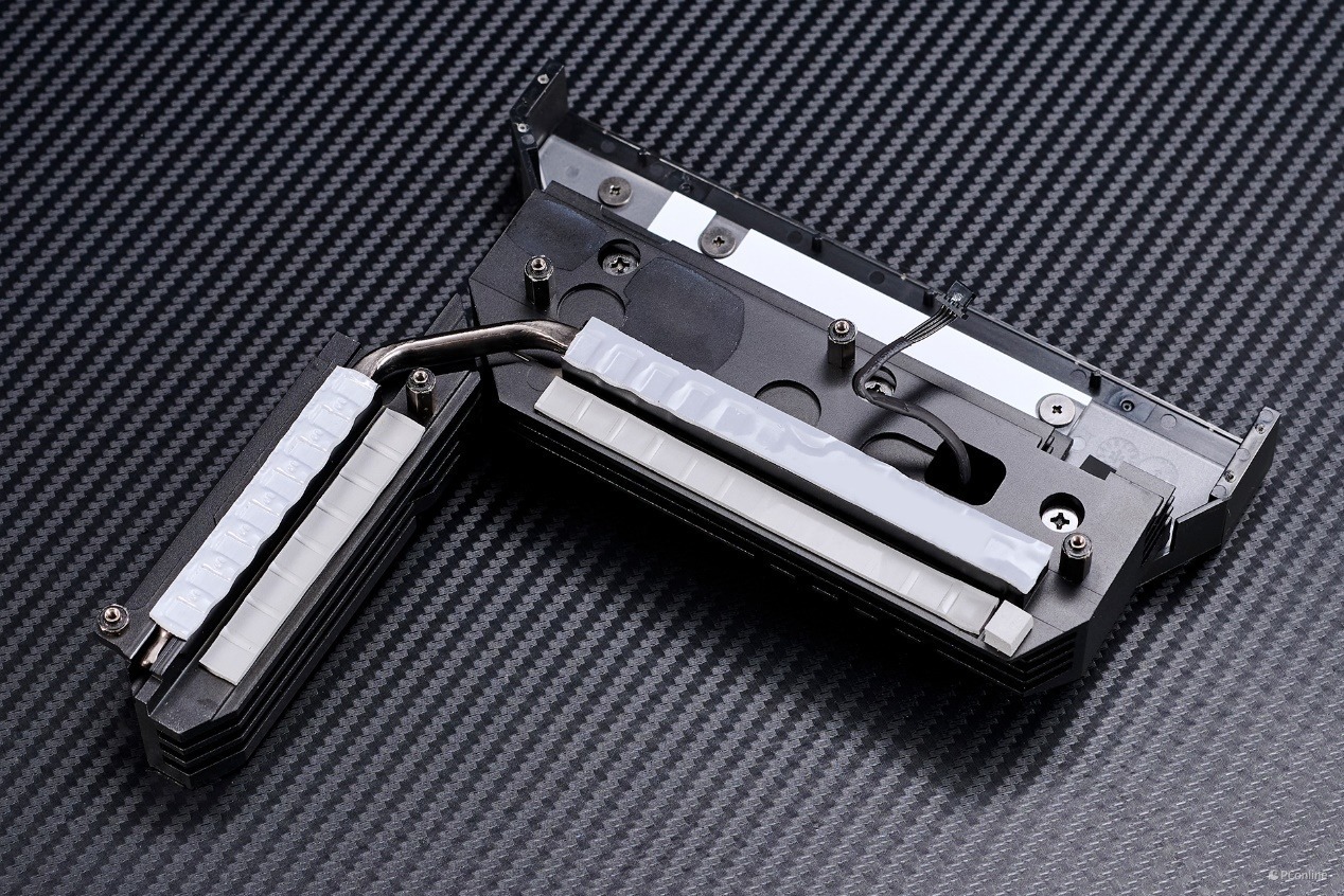 首先是整个VRM冰霜铠甲非常厚实,拿在手里沉甸甸的。并且其采用了纯金属设计,还用复合热管以及7W/mk高效能导热贴,覆盖了整个Mos管与电感,进一步保证性能稳定释放。
