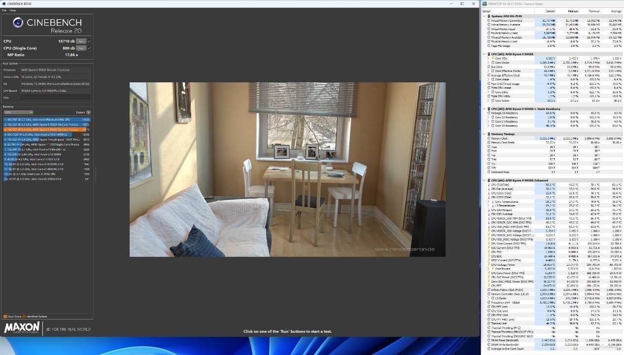 最后是CineBench系列测试,就从R20开始吧。实测R9-9950X的单核成绩为880 cb,多核为15710 cb,MP Ratio是17.86x。