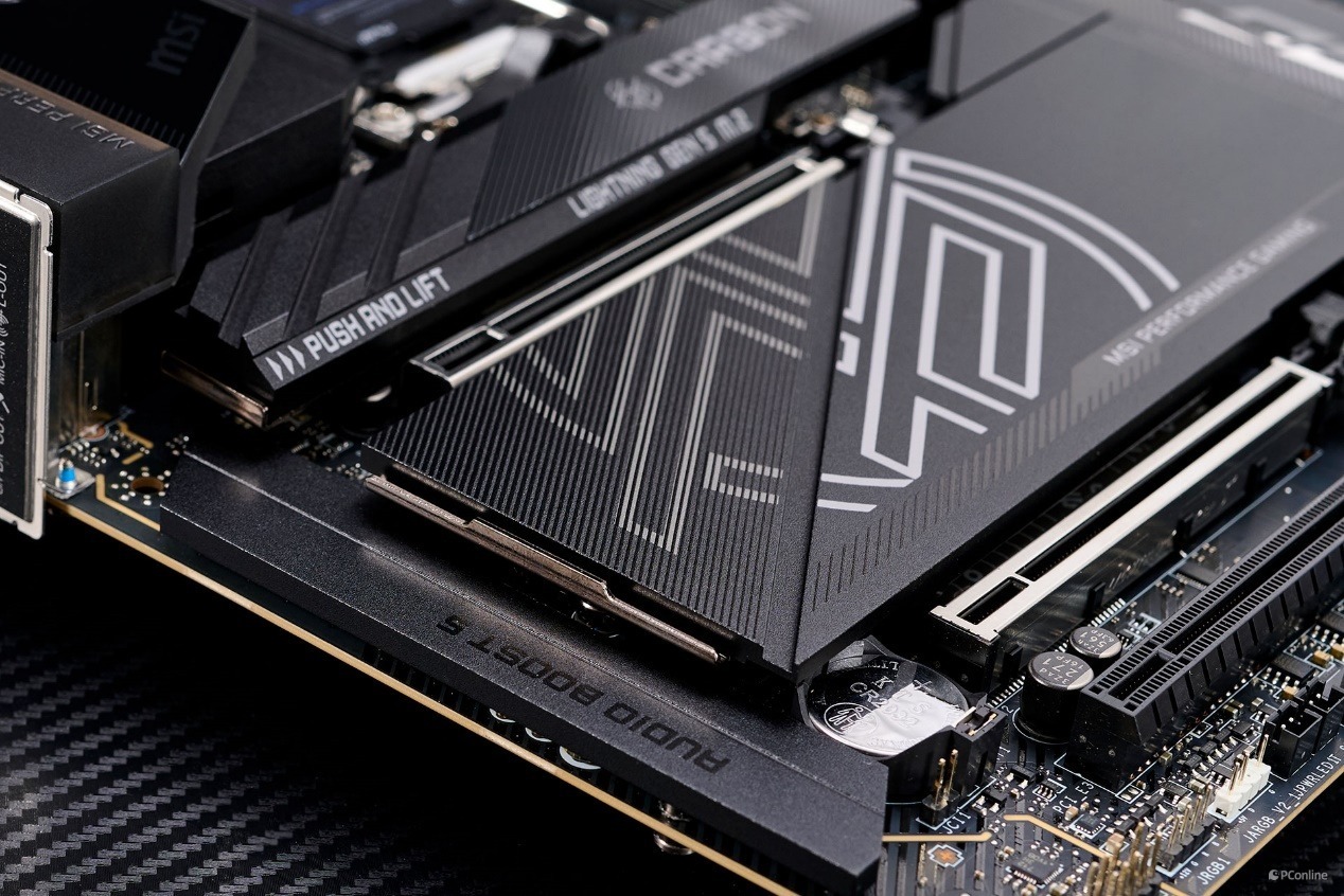 微星MSI MPG X870E CARBON WIFI暗黑主板提供了三条PCIe插槽,其中PCI_E1为处理器提供的PCIe 5.0×16插槽,而PCI_E2其实是物理上的PCIe 5.0×4插槽,最后的PCI_E3则是PCH提供的PCIe 4.0×1插槽。