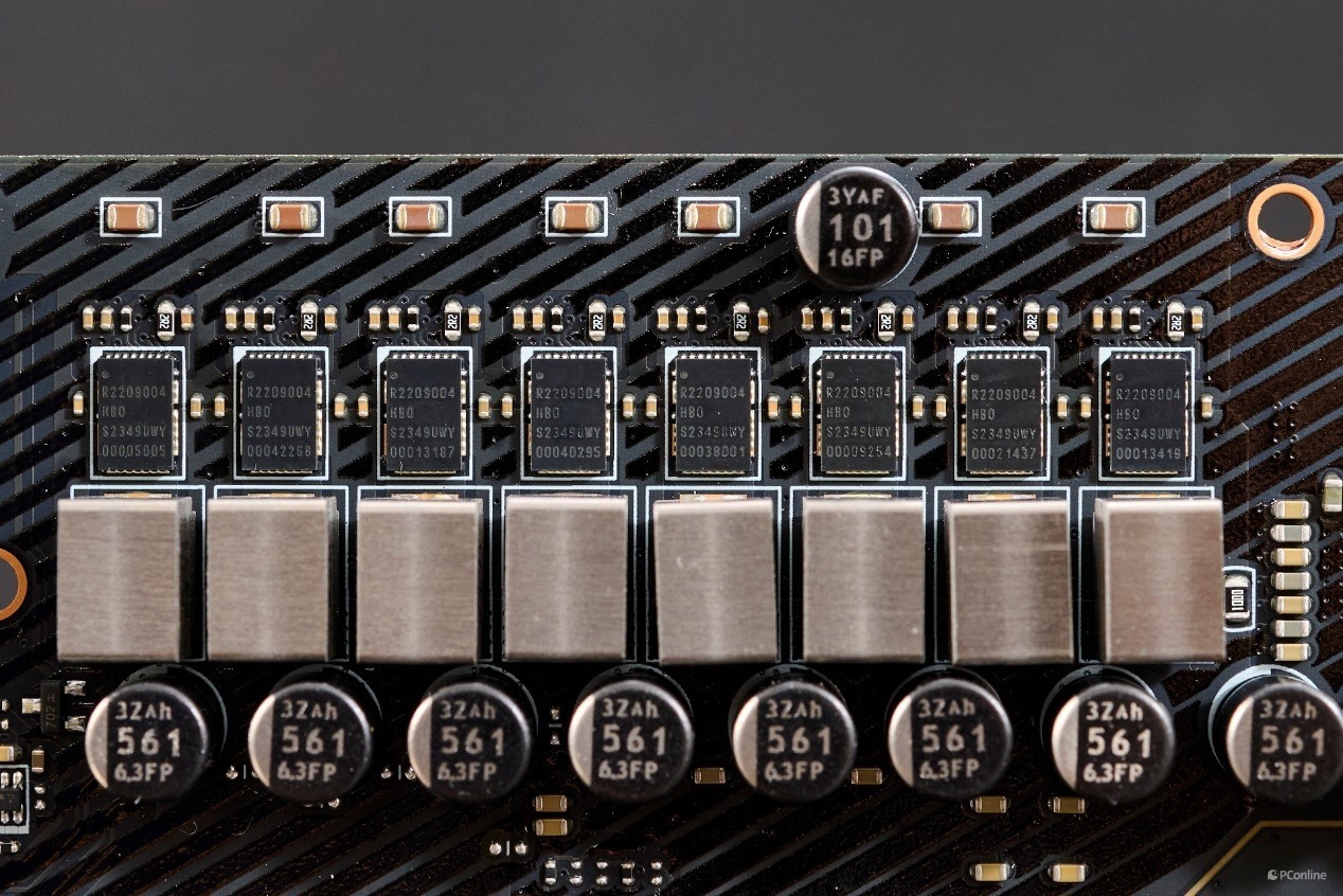 卸掉外表的散热马甲以后,主板的供电模组一目了然,微星MSI MPG X870E CARBON WIFI暗黑主板采用的是18+2+1相智能供电设计。