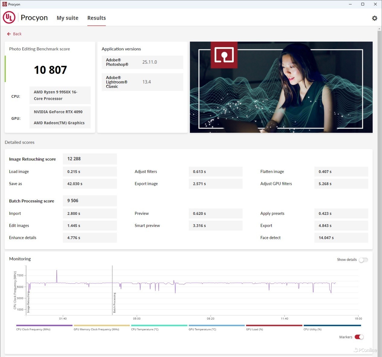 第二项是图像编辑测试,这个项目会用到PS以及LR这种比较吃CPU性能的软件,R9-9950X配微星MSI MPG X870E CARBON WIFI暗黑主板可以说是丝般顺滑,完全能够释放应有的性能,实测得分10807。
