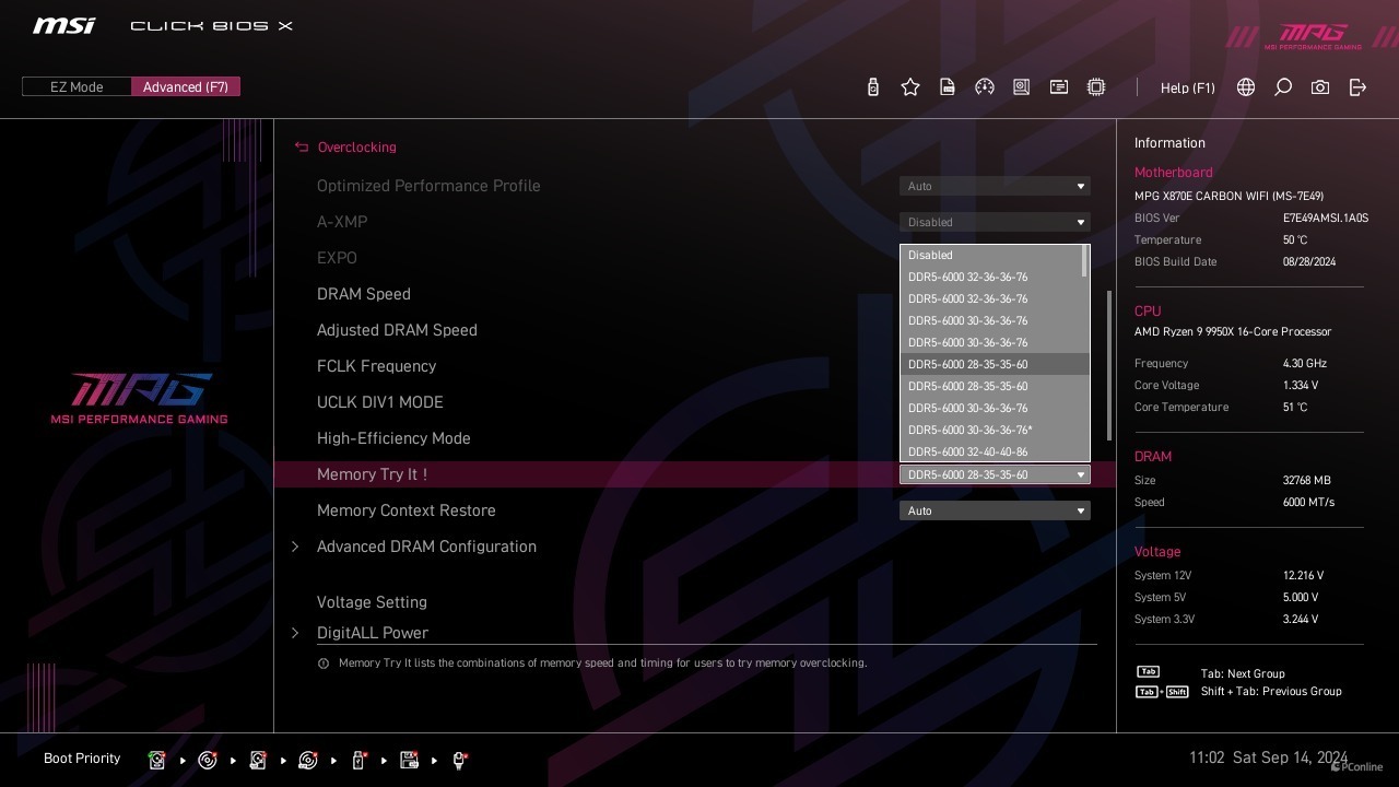 如果你的内存体质足够优秀,那这里推荐你继续用MSI Memory Try It!功能继续压榨它,Memory Try It! 能够提供更高的内存频率和更紧的参数组合,像我们手上的这套DDR5-6000内存可以压时序到CL28-35-35-60!