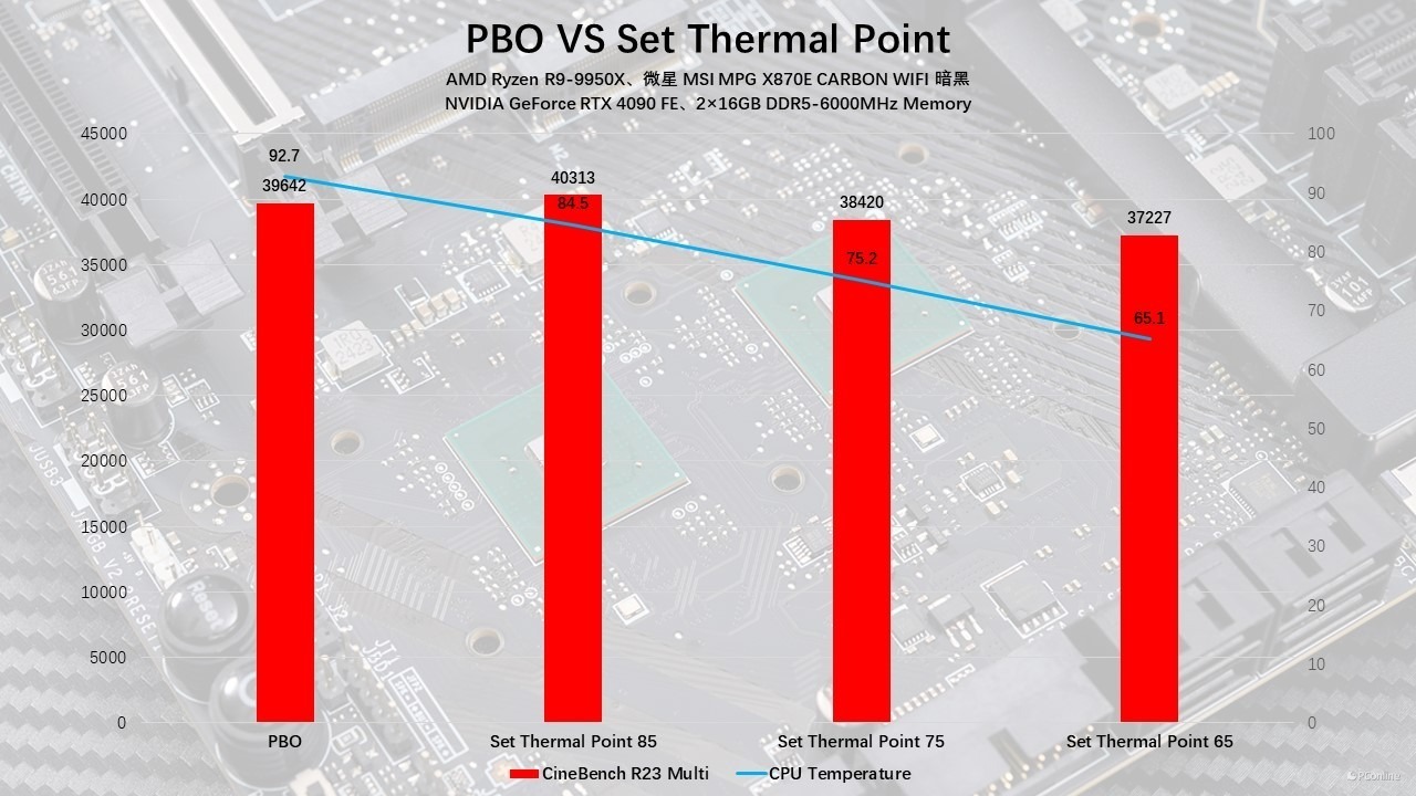 当然,如果你觉得温度高的话,微星MPG X870E CARBON WIFI暗黑主板上还能设置CPU的温度墙。与R9 7950X一样,新款R9-9950X在满载下温度可达95°C,不过BIOS里你可以给这颗处理器设置85°C、75°C和65°C三种温度限制。