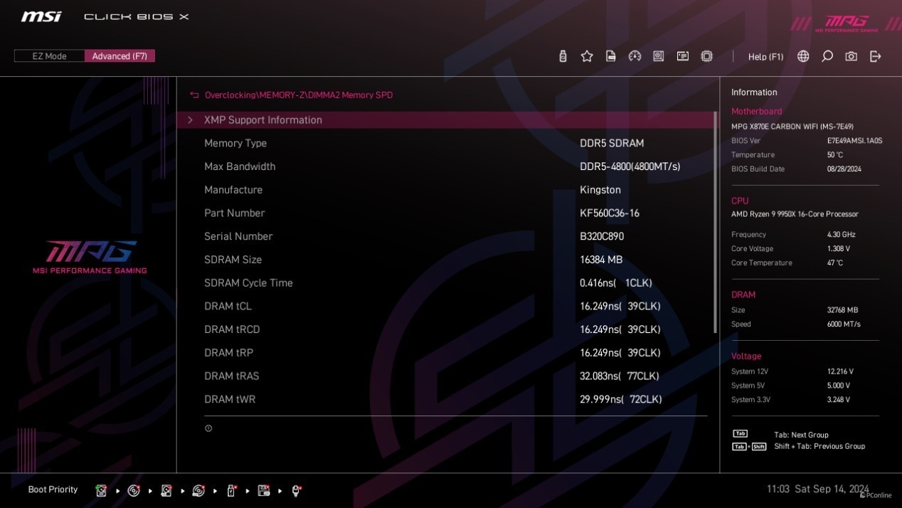 另外,高级模式下还能查看DDR5内存的详细规格,我们手上的内存内置EXPO参数,相比一些只有A-XMP配置的内存来说,性能会更加强势,测试时我们也会开启EXPO配置。