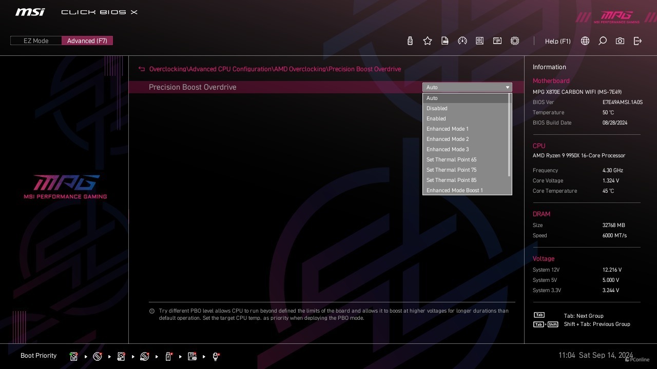 开启也很简单,只需要在BIOS的PBO选项里选择对应的ENHANCE模式就好了,微星给到了三档设置,分为1-3档,其中3档最猛。