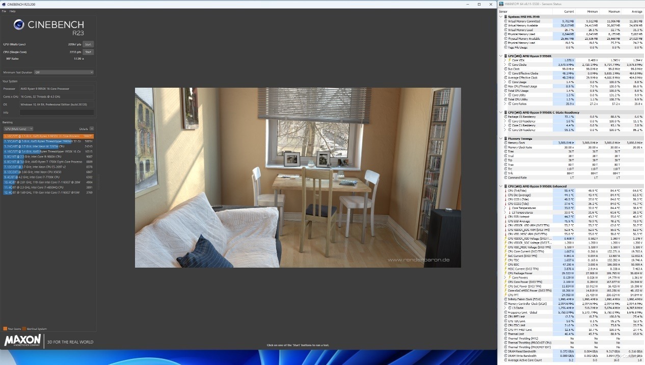 R23的压力就更大了,不过R9-9950X的表现还是令人惊喜,仅仅靠PBO Auto就跑出了多核39967 pts的成绩,要知道这个成绩换做隔壁i9来,分分钟频率得上6GHz才有可能,并且还有一定风险。