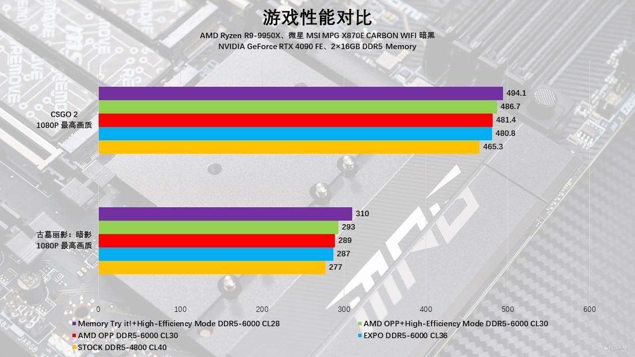 游戏效能方面也有长进,在1080P分辨率下,Memory Try It! 的DDR5-6000 CL28-35-35-60搭配High-Efficiency Mode,游戏性能比AMD OPP强了约3~8%,比DDR5-6000 EXPO则强了4~10%。