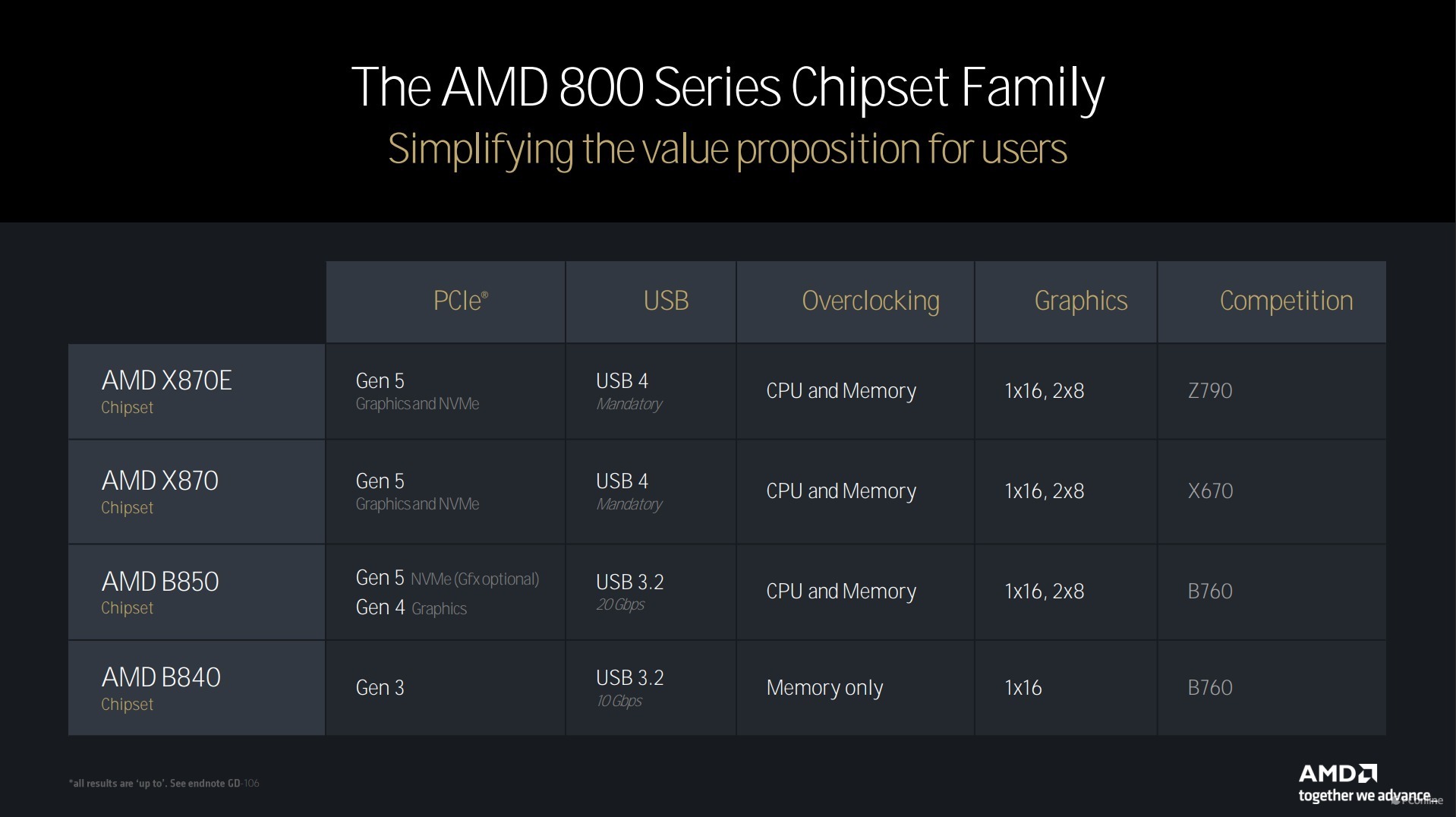 另外整个AMD 800系芯片组一共会有四款,分别是最顶级的X870E,X870以及定位主流的B850及全新的B840。不过最后这个B840更像上代的A620,其不支持CPU超频,仅支持内存超频,并且南桥芯片不提供PCIe 4.0,仅有8条PCIe 3.0,而且CPU提供的PCIe通道也只有4.0,没有USB 4接口。