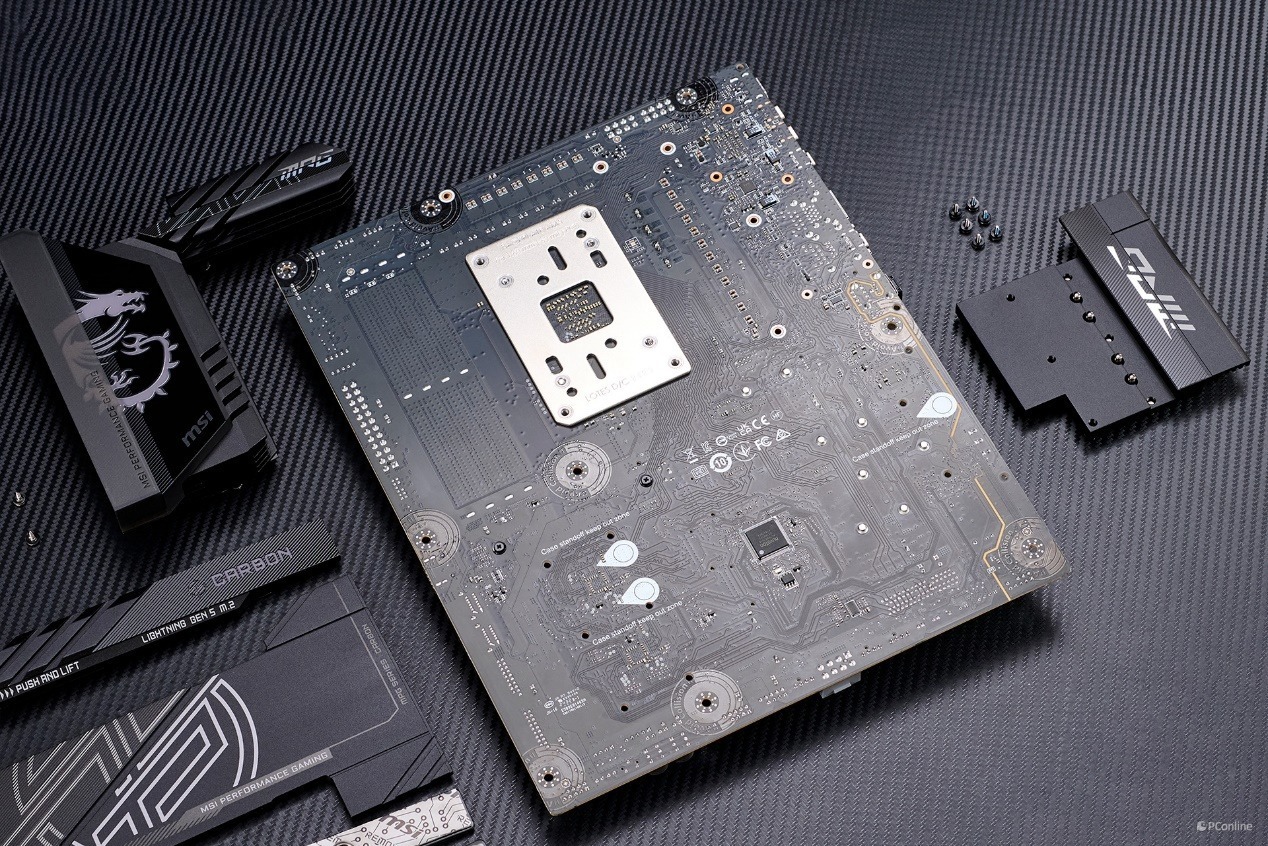 你以为这就完了,我们发现微星MSI MPG X870E CARBON WIFI暗黑主板的I/O其实是双层PCB设计!这在主板上还是比较少见的,卸掉顶部的散热装机就能清楚看到两层PCB分别控制着不同的接口。