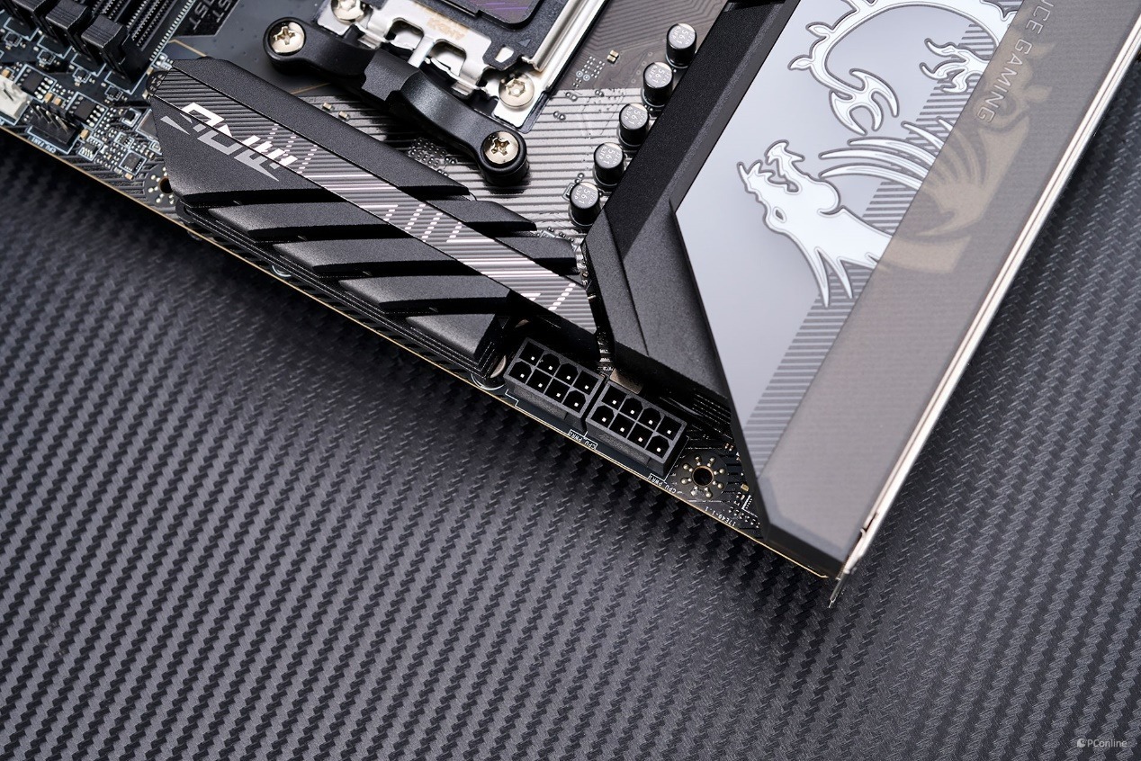 值得一提的,微星MSI MPG X870E CARBON WIFI暗黑主板的底部其实还有一个PCIe 8Pin辅助供电接口,据悉是为了满足未来显卡的需求所设计。